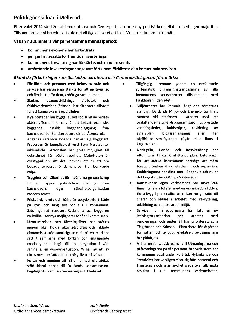 Efter valet 2014 stod Socialdemokraterna och Centerpartiet som en ny politisk konstellation med egen majoritet. Tillsammans var vi beredda att axla det viktiga ansvaret att leda Melleruds kommun framåt.