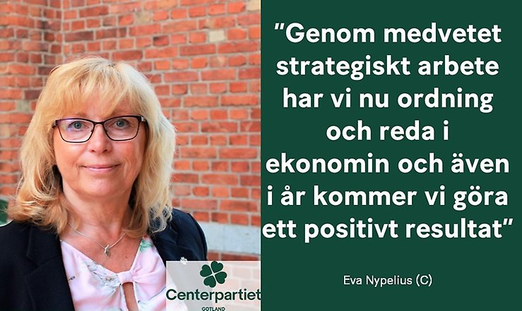 Centerpartiet har tillsammans med samarbetspartierna i Alliansen på Gotland sett till att vi har en stark ekonomi och kan öka budgeten för vård, omsorg och skola - samtidigt som vi har en buffert för oförutsägbara händelser. Eva Nypelius tycker det ser bra ut för Gotland, även om det finns vissa orosmoment.