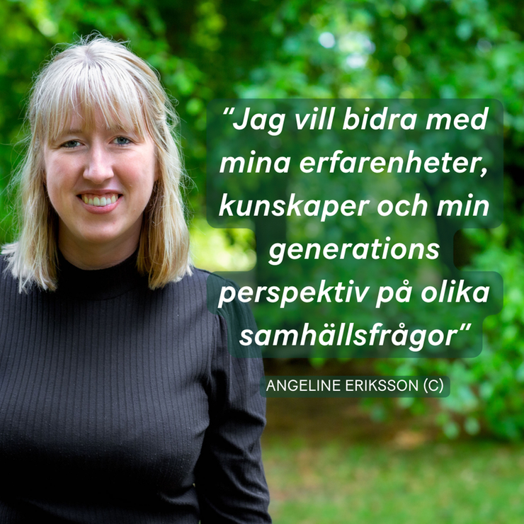 Angeline Eriksson,vice ordförande i distriktsstyrelsen, politisk talesperson för utbildning och infrastruktur för Centerpartiet Halland, ersättare i Region Hallands Närsjukvårdsnämnd och vice ordförande i kommunfullmäktige i Laholms kommun.