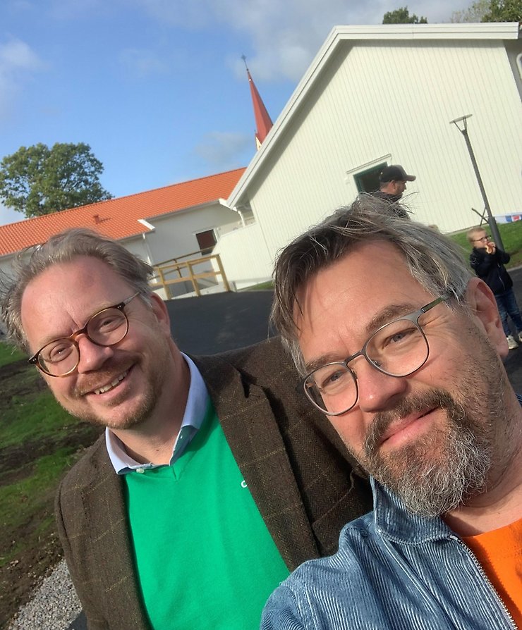 Christian Persson och Calle Wikelund framför de nya lägenheterna i Gödestad som kunnat byggas tack vare nytänkande och ny teknik.