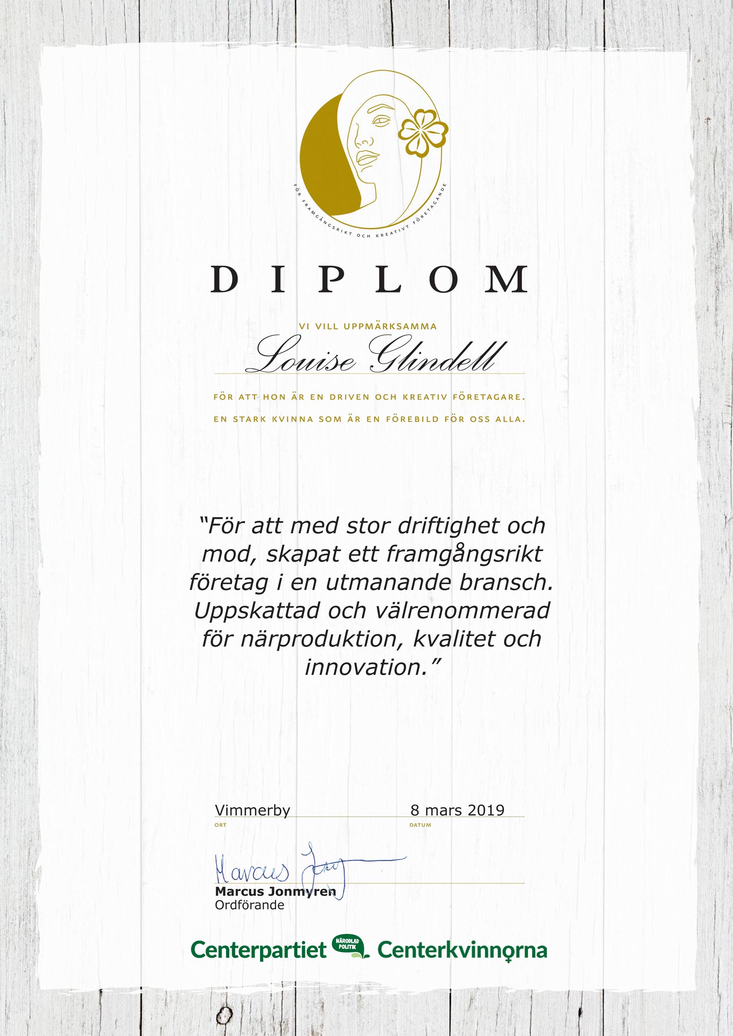 Louise Glindell, Sjundekvill, Storebro, tilldelas Centerpartiet i Vimmerby kommuns pris till 2019 års företagarkvinna. Ett pris som Centerpartiet tagit in nomineringar från allmänheten till. Totalt har det kommit in ett tiotal nominerade kandidater.