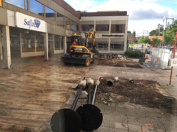 Entrén utanför Safiren eller Folkets hus i Katrineholm byggs om. Bort med handikapparkering, stenplattorna, träbänkar, trälådorna som avgränsade rabatten, magnolia och taggbuskar. In med helt ny gatsten och nytt betongmonument.