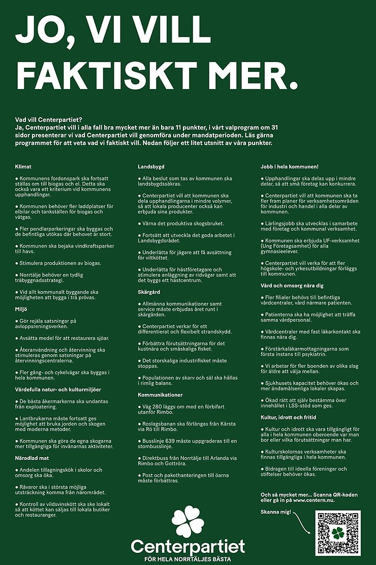 På Centerpartiets valsedel till kommunvalet finns många namn. Vi kommer från stad och tätorter, från landsbygd och skärgård. Vi representerar alla delar av kommunen och har vitt skilda yrkeslivserfarenheter. Flera av oss är lantbrukare eller engagerade i de gröna näringarna. Vi är unga, medelålders och äldre. Vi tror att vi tillsammans på ett bra sätt kan förstå och verka för invånarnas bästa. Din röst är viktig för att vi fortsatt ska få det förtroendet!
