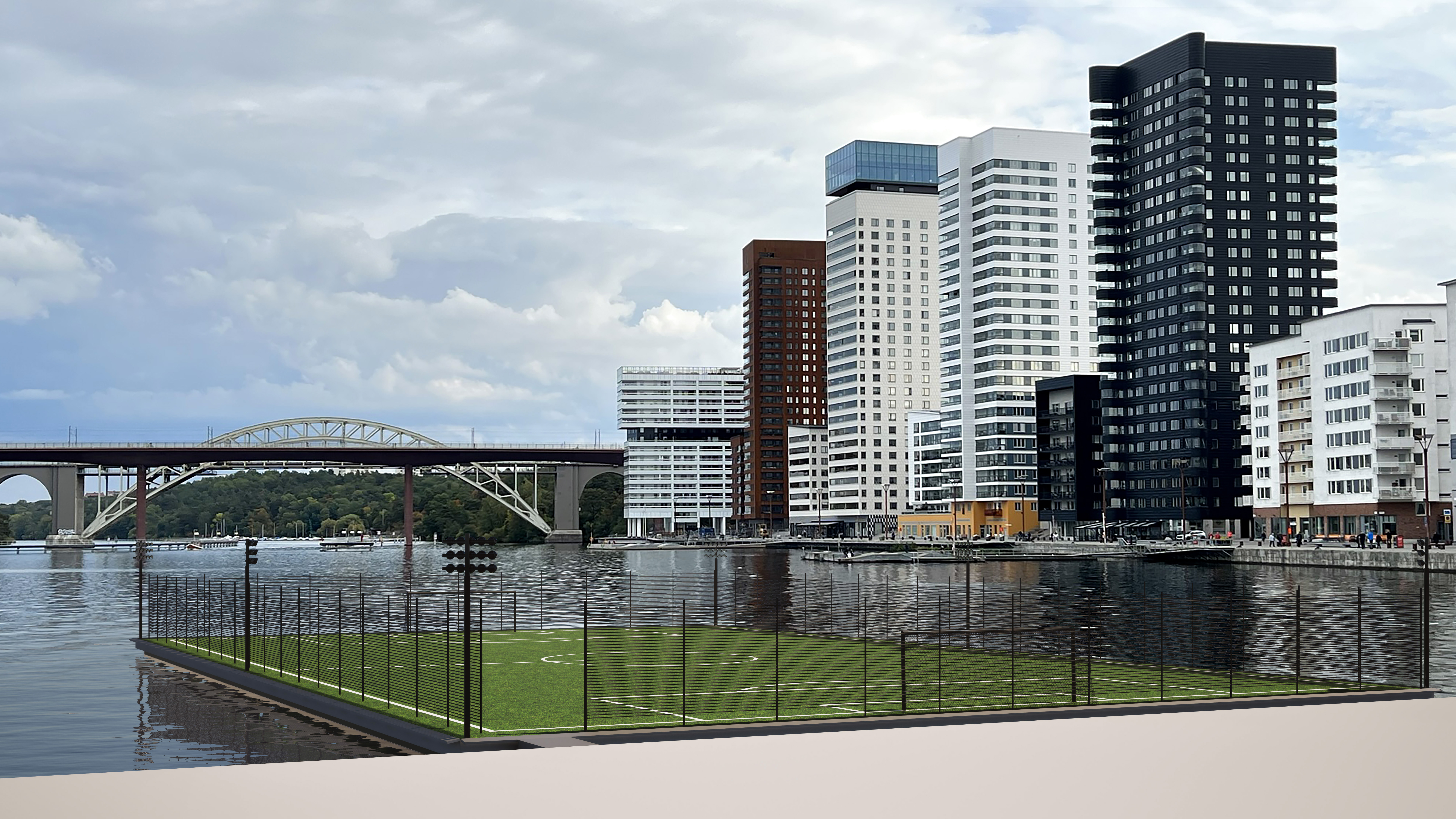 Centerpartiet vill se flera flytande fotbollsplaner i Stockholm. Illustration/foto: Tea Nygren/Martinsson, M